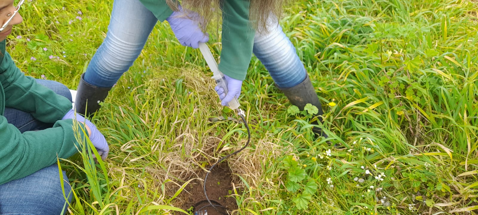 Equipa do ISA a efetuar medições de gases do solo, para cálculo da pegada de carbono, no final de março de 2024.