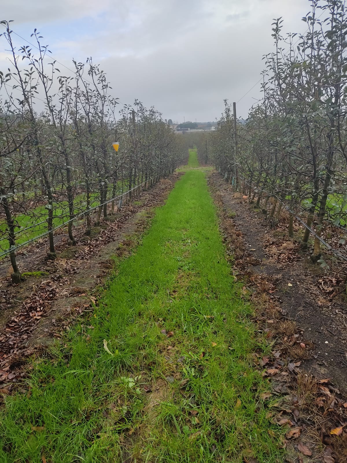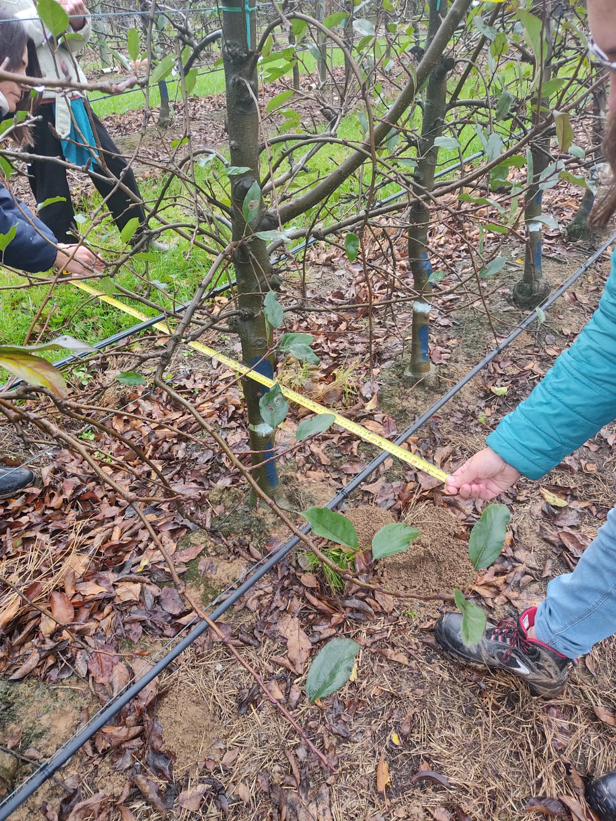 Imagens do processo de medição das volumetrias, nos pomares de ensaio do projeto, pela equipa do INIAV, IP e técnicos das PME´ s em dezembro de 2024.